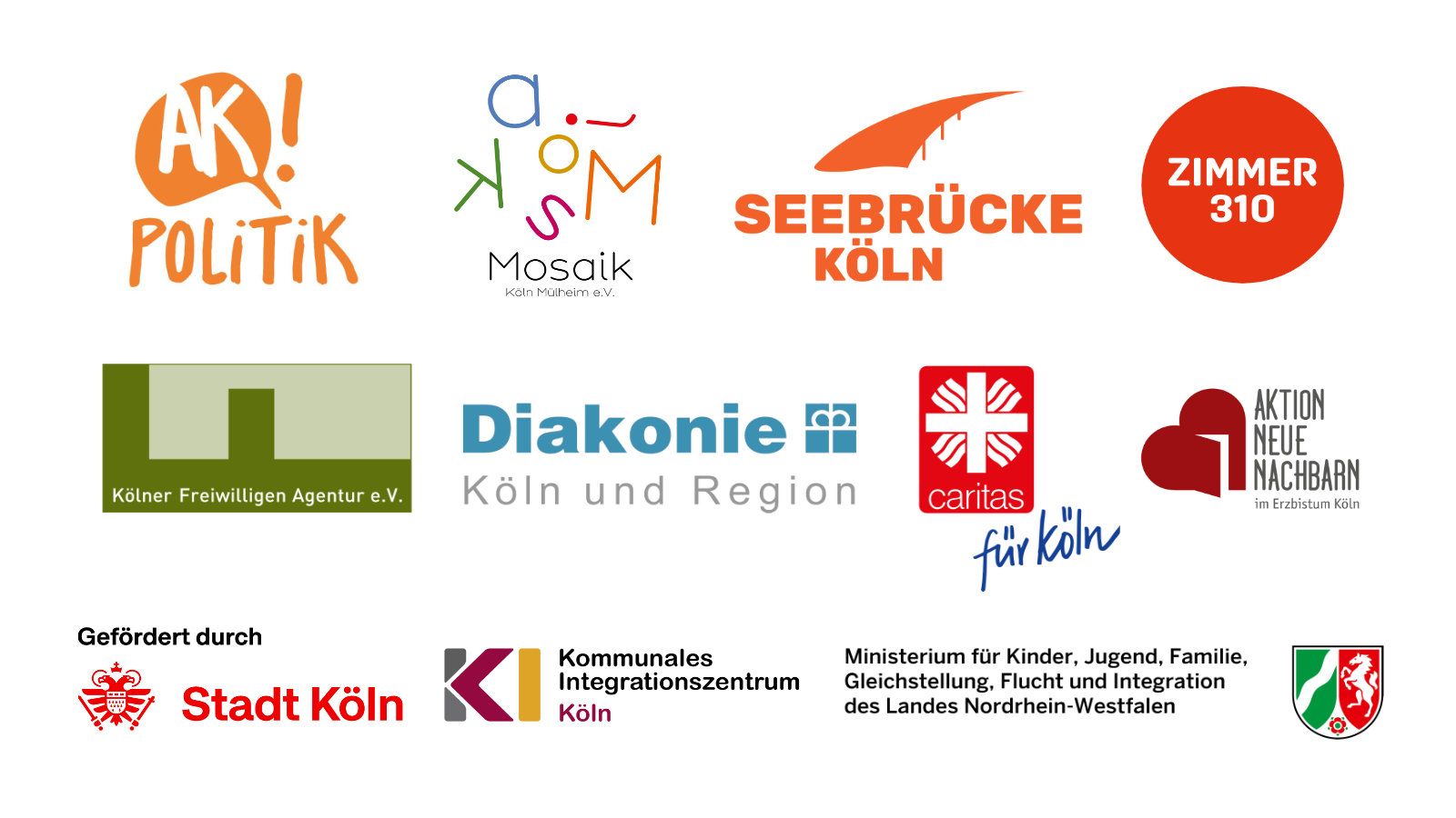 AK Politik der Kölner Willkommensinitiativen / ANN – Aktion Neue Nachbarn / BFmF – Begegnungs- und Fortbildungszentrum muslimischer Frauen / Caritas für Köln / Ceno & Die Paten e.V. / DAKO e.V / Diakonie Köln und Region / Flüchtlingshilfe Zündorf-Ensen / FluMi Vingst / hallo in sülz / Integrationsrat der Stadt Köln / Jama Nyeta gGmbH / Köln zeigt Haltung / Kölner Flüchtlingsrat / Kölner Freiwilligen Agentur / KVMO e.V. – Kölner Verbund der Migrantenorganisationen / Melanchton Akademie / Mosaik Mülheim e.V. / NIL – Netzwerk Integration Lindenthal / Rom e.V. – Roma-Selbstorganisation für Teilhabe, Bildung und Kultur / Runder Tisch für Flüchtlingsfragen der Stadt Köln / Runder Tisch Riehl / Seebrücke Köln / SkF Köln – Sozialdienst katholischer Frauen e.V. / Start with a Friend Köln / Veedel e.V. / Willkommen in der Moselstraße / WiRo – Willkommen in Rondorf, Hochkirchen und Hönningen /
